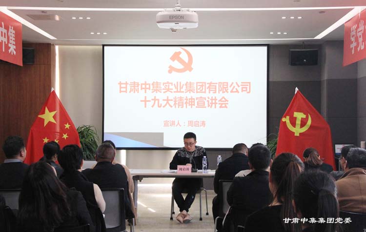 11月23日下午,甘肃中集实业集团有限公司党委在公司党建活动室开展党的十九大精神专题教育活动,公司党委书记、董事长周启涛代表集团公司党委,以《深入学习党的十九大精神,建设美好幸福新兰州》为主题,向公司全体党员、入党积极分子、集团公司各版块及各部门负责人宣讲党的十九大精神。