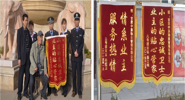 2015年3月25日早上10点,幸福里小区保安室门口站着一位老人,手中拿着一面锦旗对物业公司领导说:“我是怀着无比诚挚的谢意来向你们表示感谢的,尤其谢谢你们保安部的全体成员”。