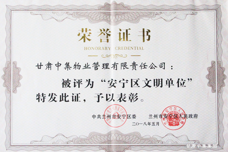 2018年5月14日下午,兰州市安宁区委、兰州市安宁区人民政府在安宁区政府第四会议室召开安宁区2017年度“文明单位”命名表彰大会。会上,甘肃中集物业管理有限责任公司被中共兰州市安宁区委、兰州市安宁区政府联合命名并授予“文明单位”荣誉称号。