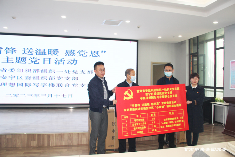 2023年3月17日,甘肃省委组织部组织一处党支部、安宁区委组织部党支部、甘肃中集集团党委联合开展“学雷锋 送温暖 感党恩”主题党日活动——向刘家堡街道幸福里社区“小蜜蜂”驿站联合捐赠价值3万余元的配套设施。